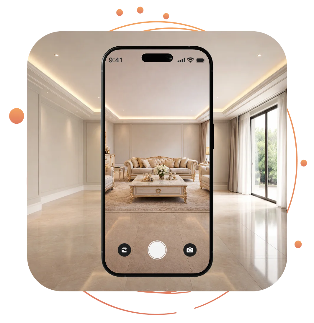 Start with a photo, choose your space and style, then generate design options you can refine in minutes.