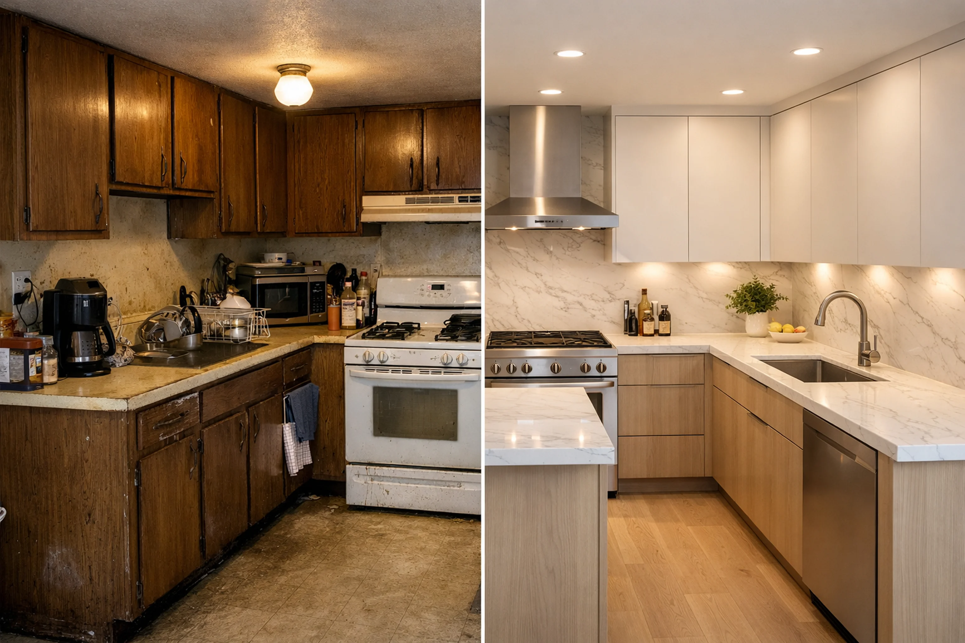 - Modern kitchen redesign, white oak cabinets, matte black hardware, quartz countertop, warm lighting, minimal styling